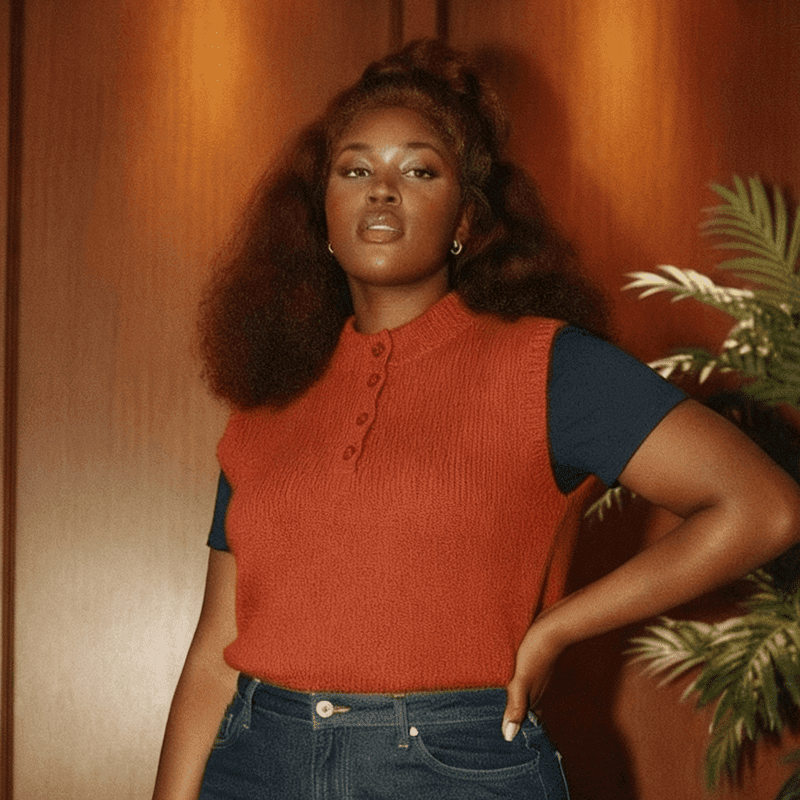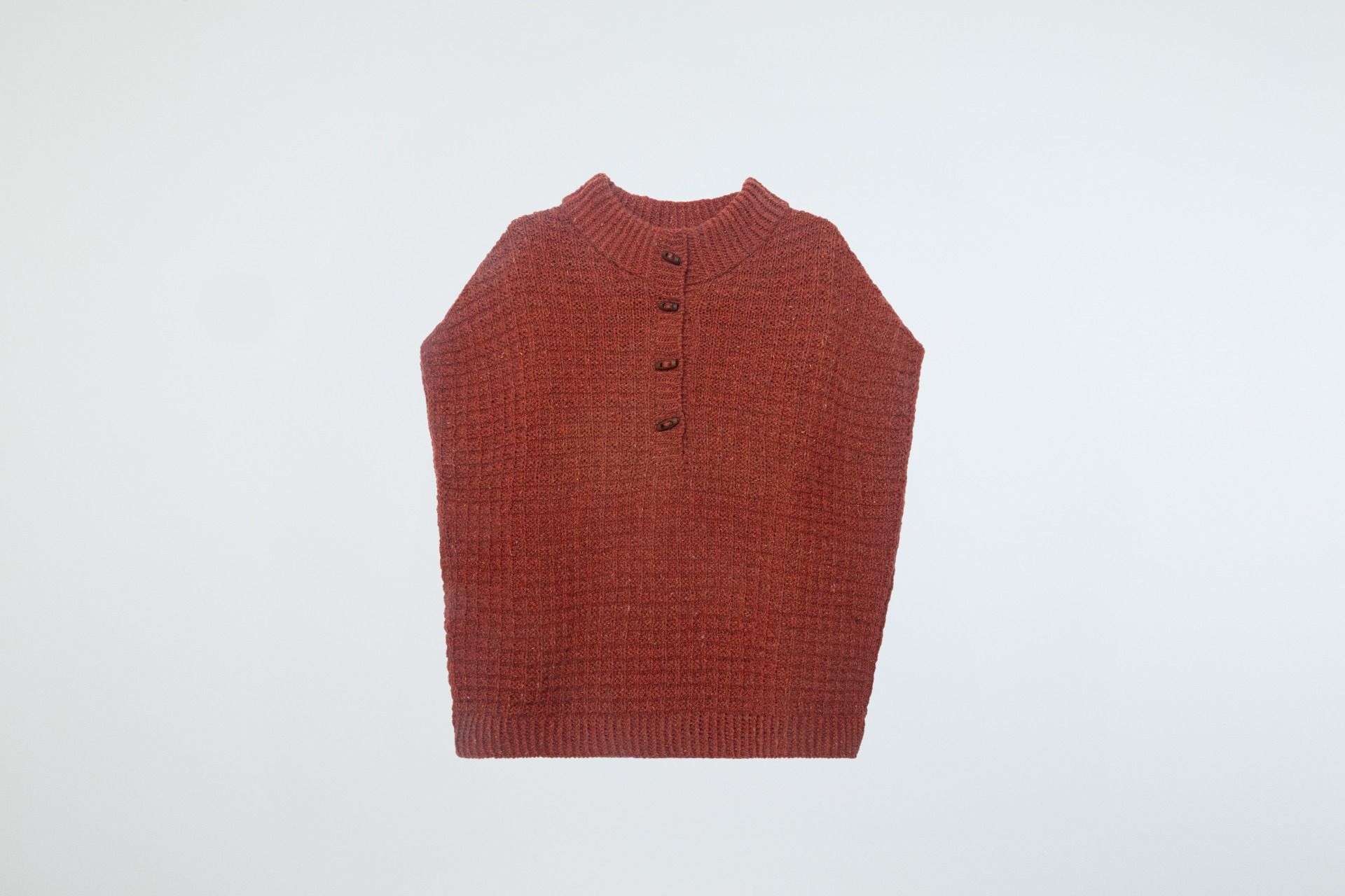 Ce débardeur, à col boutonné montant, est proposé en 2 tailles : il comporte une aisance d’environ 20 cm et il faut donc choisir sa taille en fonction de la largeur souhaitée. Il est tric. de haut en bas, d’abord en aller/retour, avec une série de rgs racc. pour arrondir l’encolure et des augm. à tous les rgs. pour former les épaules. Puis on sépare dos et devant pour ouvrir les emmanchures et enfin, il est fermé en rond pour tric. le corps. Un col double est tric. sur m. relevées puis deux bandes de boutonnages